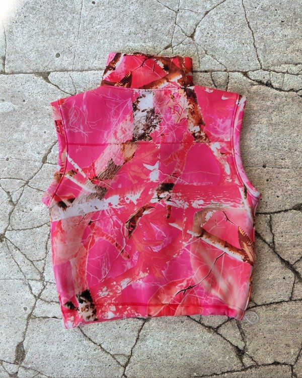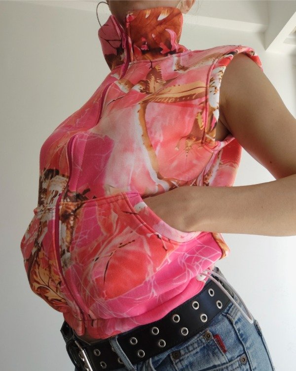 Chaleco "árbol rosa", confeccionado en tela de algodón con lycra y friza en el interior. Sublimado con estampa propia. Con elástico y tancas en la cintura para ajustar. La prenda tarda aproximadamente cinco días en confeccionarse.