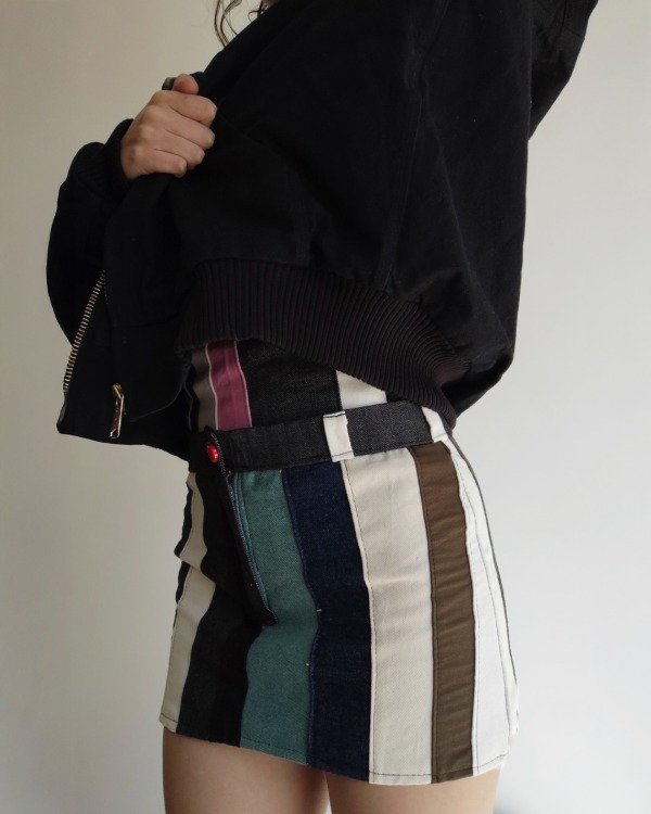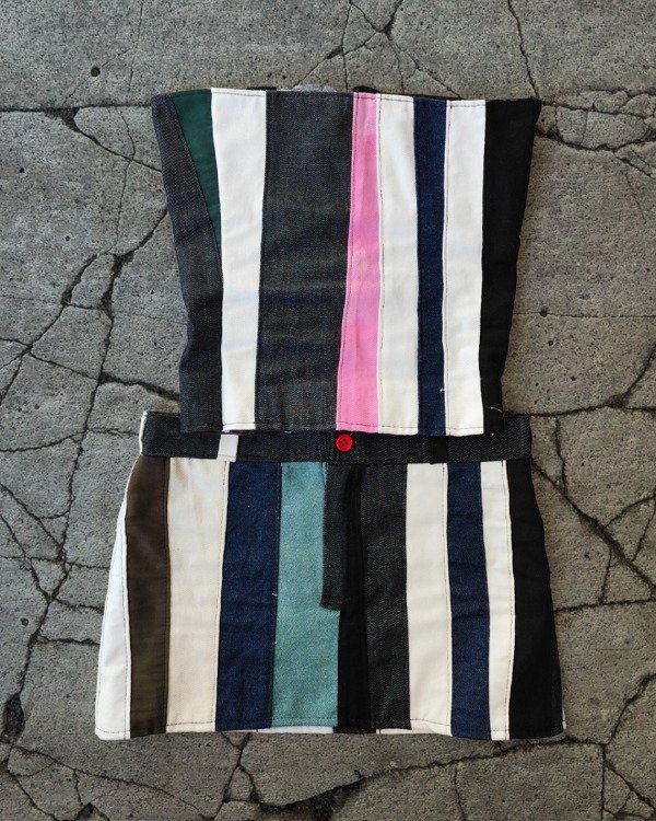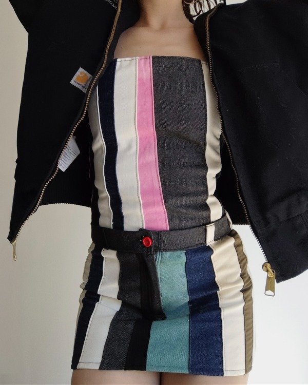 Conjunto de top y pollera hecho con retazos de jeans y gabardinas, ambas prendas con forro interno.El top es regulable en la espalda. La pollera cuenta con botón y cierre .